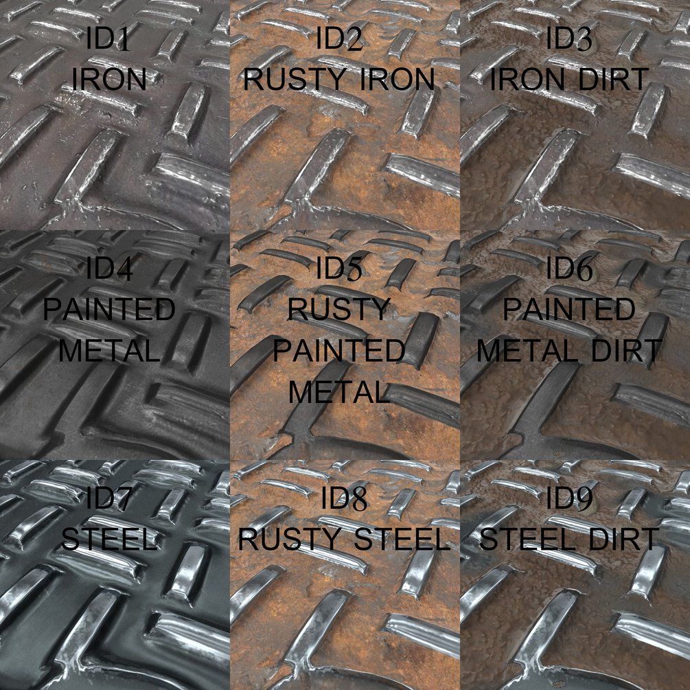 The 3d model has a 9 V-Ray multisub material, and each sub material is using 5 different 4k maps. You can choose the material by changing the id in the "Material" modifier on top of the model.